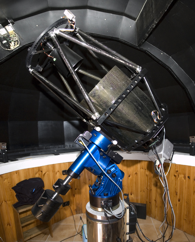 Telescope: Ritchey Chretien optical design Aperture: 350mm Focal ratio: f/8 Focal Lenght: 2800mm CCD: Sbig STL11k Pixels size: 9x9micron Array size(pixel): 4008x2672 in bin 1x1 Chip size: 24mm x 36mm Image scale: 0,66 arcsec x pixel Fiel of view: 29,5 x 44,2 arcmin Field flattener: Realizzato da Massimo Riccardi Weight: 35kg (scope + imaging train) |