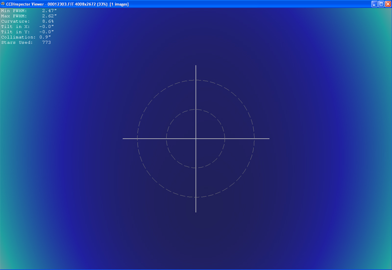 Note The test was carried out under non optimal weather conditions (these conditions were empirically estimated with reference to better conditions already occurring from the same observing site). Transparency was not optimal with high humidity (measured at about 80%). The tests were performed on frame of 15min each one, taken using adaptive optics at the speed of 7Hertz, with a 8.6mag guide star. In this single frame the measured curvature value is 8.6%, and now appears to be the best reading value. While 11% is the average curvature value taken over several frames.