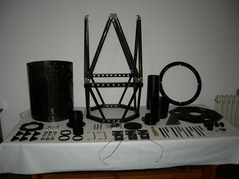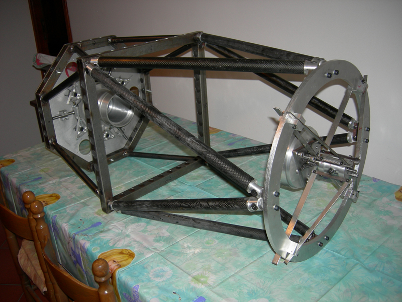 This kind of telescope was created for several reasons: one was the technical need to have a large paved area in order to fully exploit the currently used CCD (Sbig 11k); also the economic factor, that the purchase of such a tool entails, has led me to this solution; but the decisive factor was to create a custom telescope having the necessary characteristics to be used with ccd. After using for some years an SCT 12 ", I decided to take the step. For optics i chose Ariete telescopi and after waiting about 8 months I have received mirrors at home. These are the characteristics: Then on December 8, 2007 I started work. I designed the production of a carbon truss system. Below are some phases of the development of the "cradle"