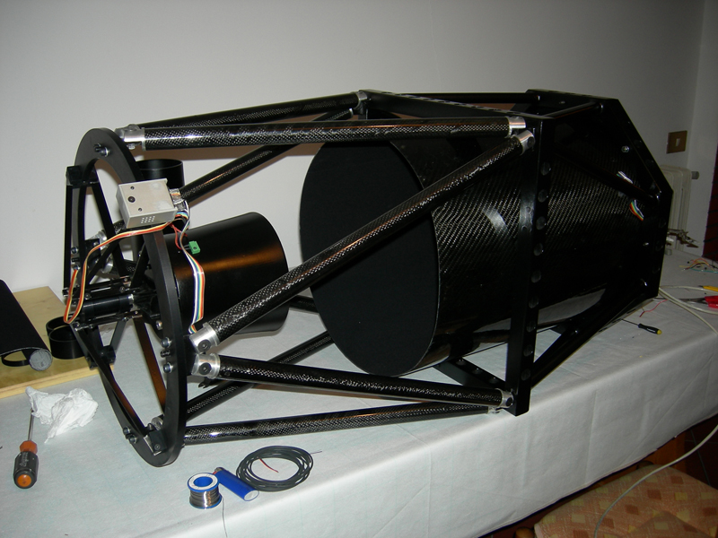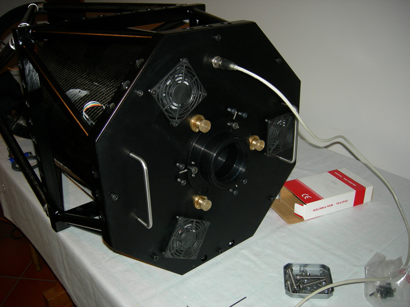 Here are the pictures of the telescope, but still without mirrors. In the rear view (pic 14) are visible the fans and the cable: Telescope is provided with an anti-condensation system located on the frame of the secondary mirror and with temperature and humidity sensors placed behind the two mirrors and over ring that support spider